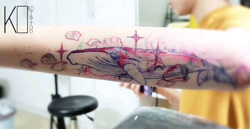 当前位置: 首页 >湖北省武汉市纹身店-KOKO TATTOO原创定制纹身店纹身图案>飘纹身图片_手臂点刺鲸鱼云伤疤遮盖纹身图案