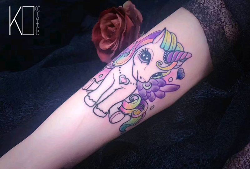 当前位置: 首页 >湖北省武汉市纹身店-KOKO TATTOO原创定制纹身店纹身图案>马卡龙独角兽纹身图片_手臂Old School水彩独角兽可爱彩虹纹身图案