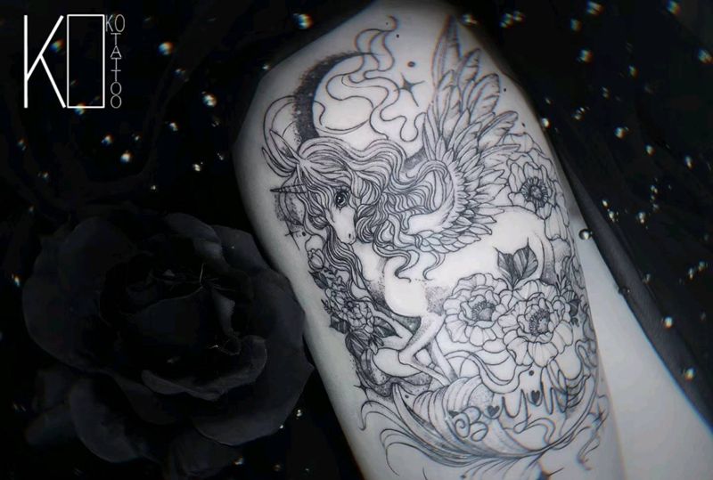 当前位置: 首页 >湖北省武汉市纹身店-KOKO TATTOO原创定制纹身店纹身图案>独角兽纹身图片_腿部点刺独角兽英文花卉纹身图案