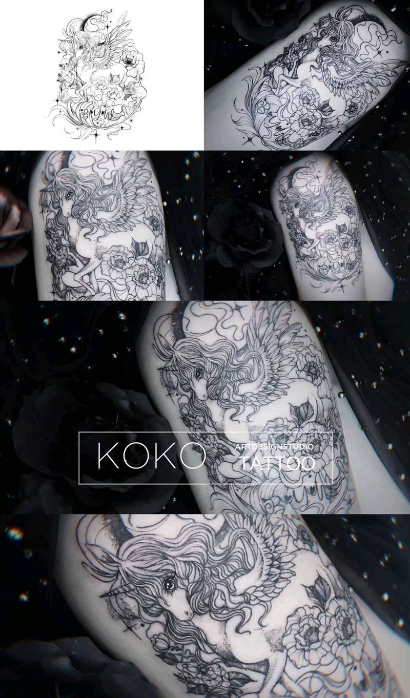 当前位置: 首页 >湖北省武汉市纹身店-KOKO TATTOO原创定制纹身店纹身图案>独角兽纹身图片_腿部点刺独角兽英文花卉纹身图案
