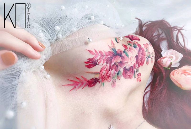 尤加利叶纹身图片_胸部肩部水彩花卉水彩遮盖纹身图案