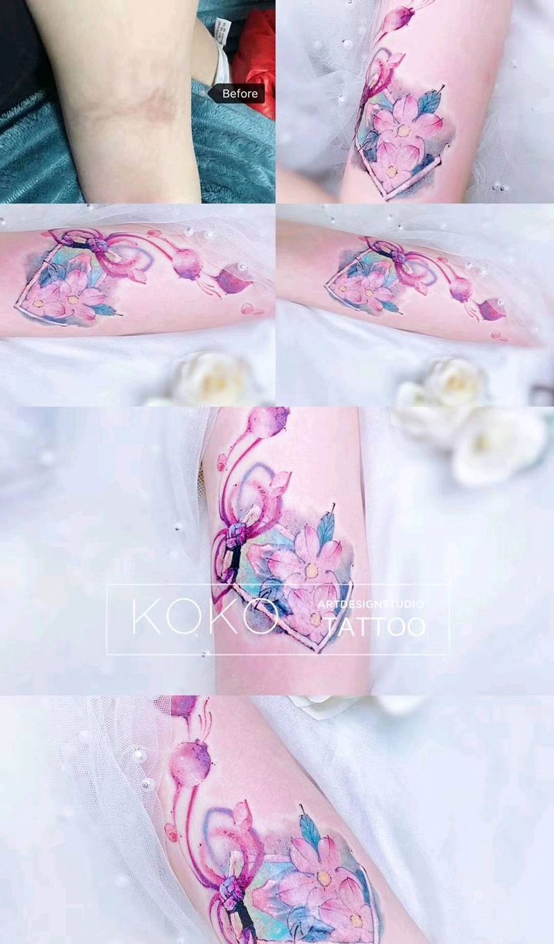 当前位置: 首页 >湖北省武汉市纹身店-KOKO TATTOO原创定制纹身店纹身图案>花语纹身图片_手臂水墨水彩遮盖樱花中国结纹身图案