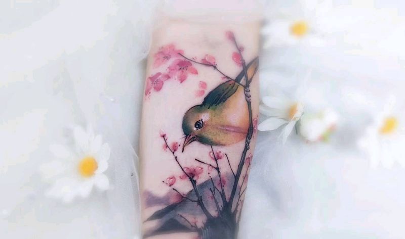 当前位置: 首页 >湖北省武汉市纹身店-KOKO TATTOO原创定制纹身店纹身图案>鸟语花香纹身图片_手臂水彩水墨鸟梅花淡彩纹身图案