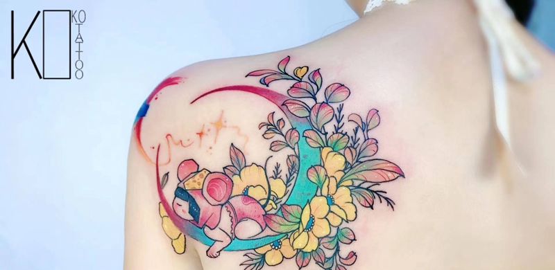 当前位置: 首页 >湖北省武汉市纹身店-KOKO TATTOO原创定制纹身店纹身图案>宝宝纹身图片_肩部背部水彩宝宝月亮定制纹身图案