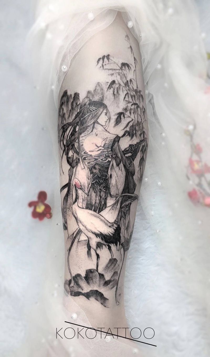 当前位置: 首页 >湖北省武汉市纹身店-KOKO TATTOO原创定制纹身店纹身图案>水墨国风纹身图片_腿部水墨水墨鹤国风纹身图案