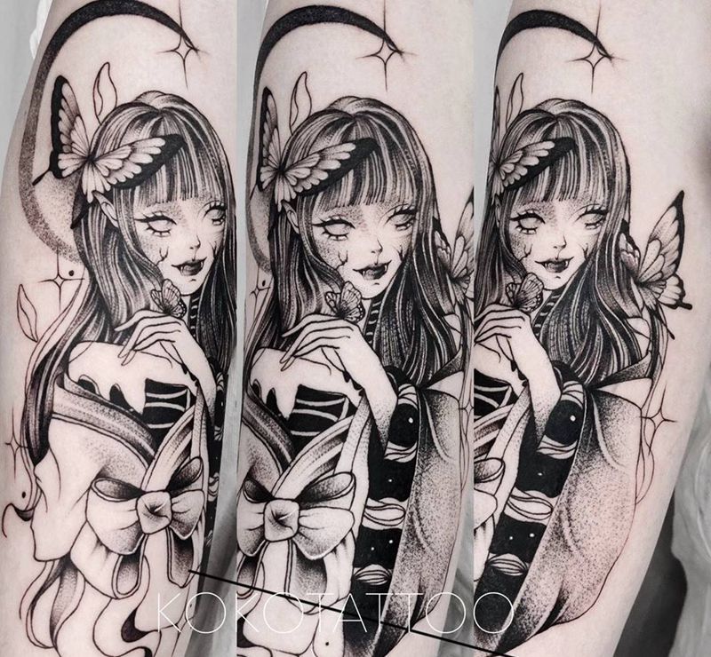 当前位置: 首页 >湖北省武汉市纹身店-KOKO TATTOO原创定制纹身店纹身图案>蝴蝶少女纹身图片_手臂点刺遮盖插画风格少女纹身图案