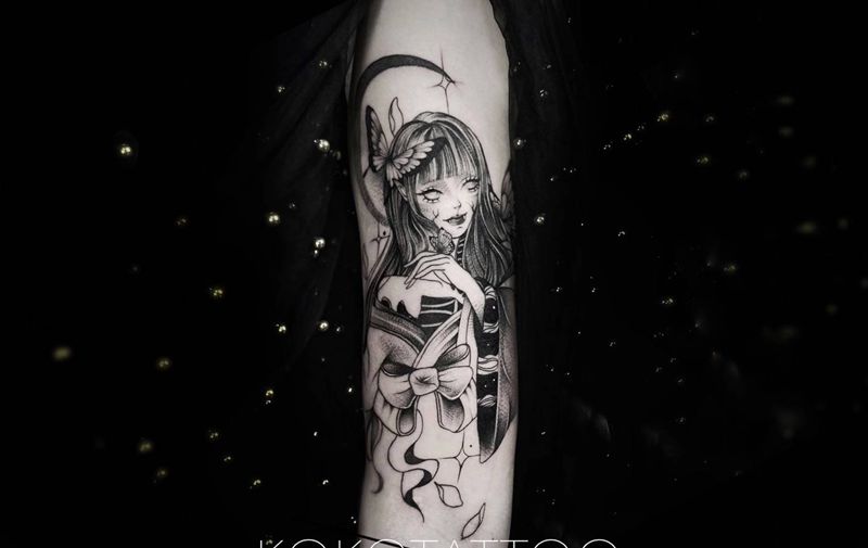 当前位置: 首页 >湖北省武汉市纹身店-KOKO TATTOO原创定制纹身店纹身图案>蝴蝶少女纹身图片_手臂点刺遮盖插画风格少女纹身图案