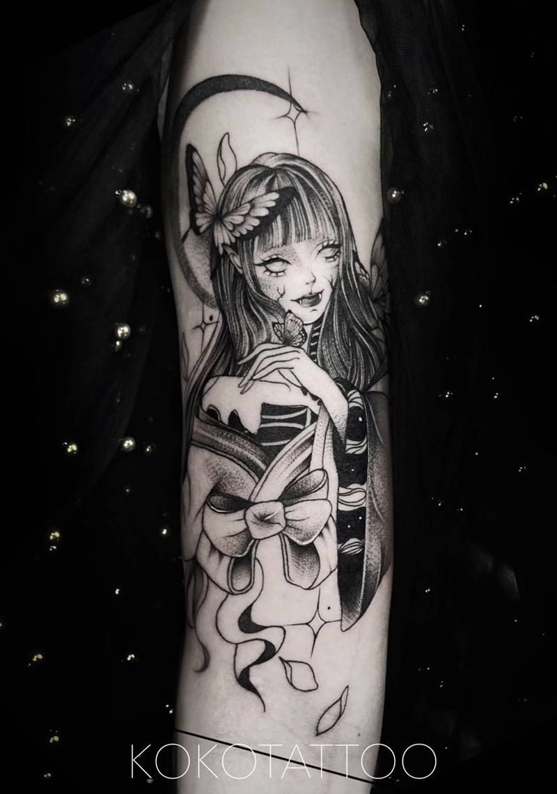 当前位置: 首页 >湖北省武汉市纹身店-KOKO TATTOO原创定制纹身店纹身图案>蝴蝶少女纹身图片_手臂点刺遮盖插画风格少女纹身图案