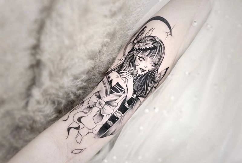 当前位置: 首页 >湖北省武汉市纹身店-KOKO TATTOO原创定制纹身店纹身图案>蝴蝶少女纹身图片_手臂点刺遮盖插画风格少女纹身图案