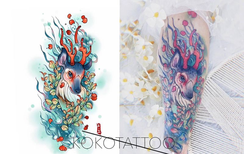 当前位置: 首页 >湖北省武汉市纹身店-KOKO TATTOO原创定制纹身店纹身图案>鹿——遮盖纹身图片_腿部水彩鹿伤疤遮盖定制设计纹身图案