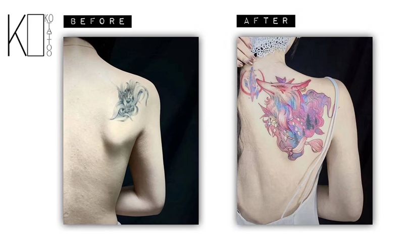 当前位置: 首页 >湖北省武汉市纹身店-KOKO TATTOO原创定制纹身店纹身图案>狐狸——遮盖纹身图片_背部水彩遮盖设计狐狸后背纹身图案