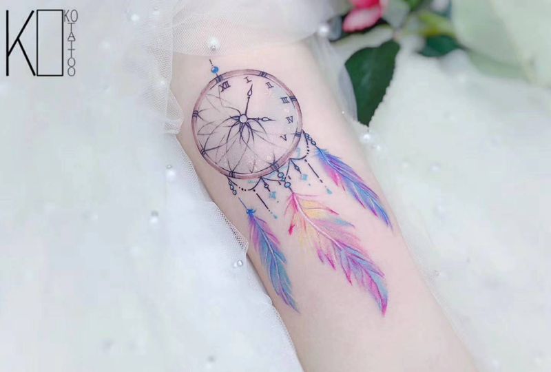 当前位置: 首页 >湖北省武汉市纹身店-KOKO TATTOO原创定制纹身店纹身图案>捕梦网纹身图片_手臂水彩捕梦网时钟一人一图纹身图案
