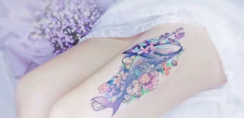鲸鱼,遮盖设计纹身图片_腿部水彩一人一图遮盖设计定制设计纹身图案