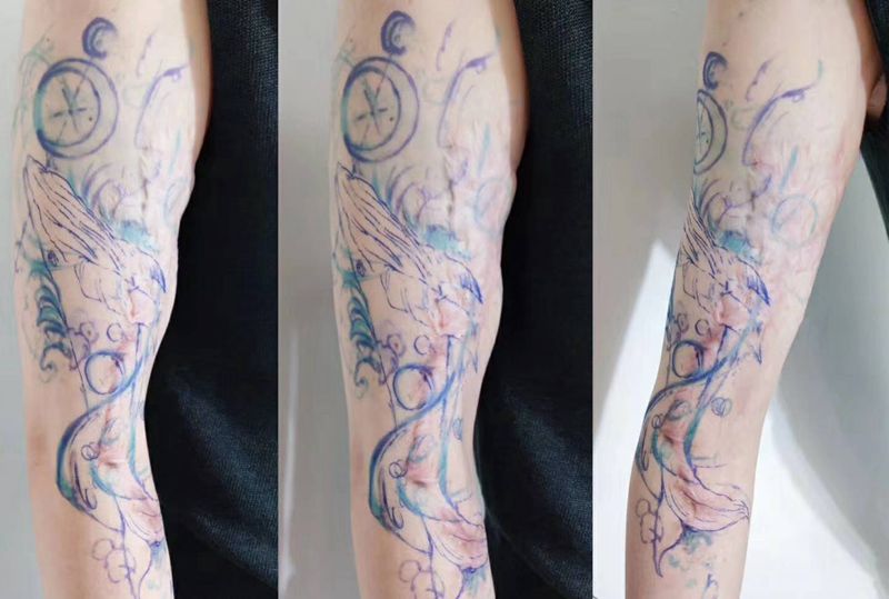 当前位置: 首页 >湖北省武汉市纹身店-KOKO TATTOO原创定制纹身店纹身图案>鲸鱼纹身图片_手臂水彩一人一图遮盖设计定制纹身图案