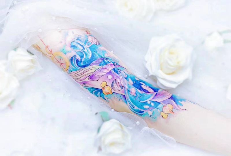 当前位置: 首页 >湖北省武汉市纹身店-KOKO TATTOO原创定制纹身店纹身图案>鲸鱼纹身图片_手臂水彩一人一图遮盖设计定制纹身图案