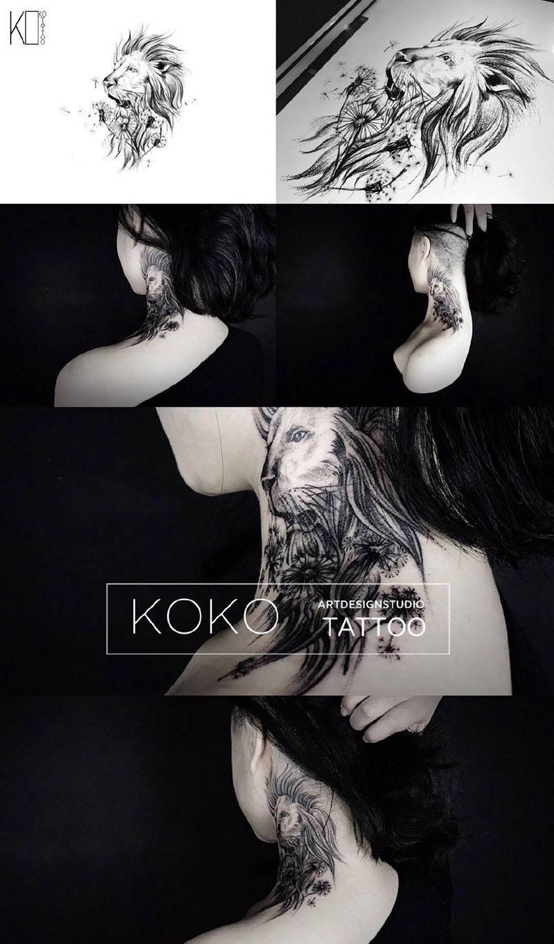 当前位置: 首页 >湖北省武汉市纹身店-KOKO TATTOO原创定制纹身店纹身图案>狮子纹身图片_颈部点刺狮子蒲公英定制纹身图案