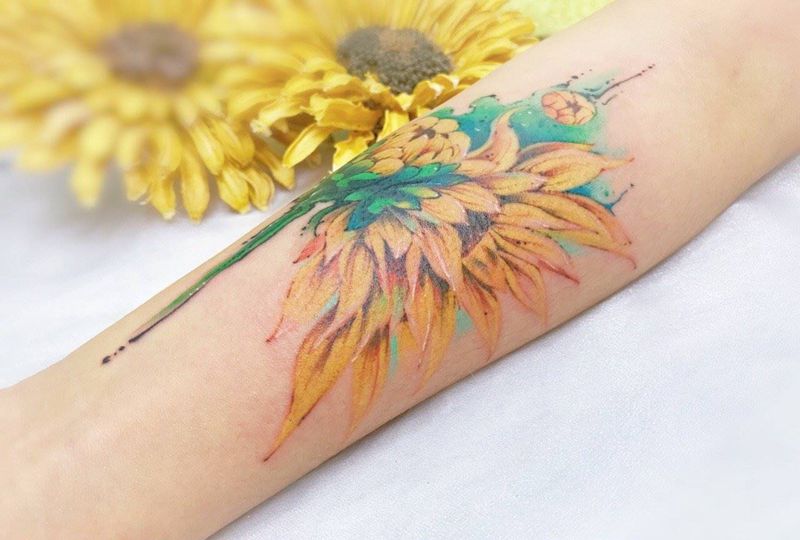 当前位置: 首页 >湖北省武汉市纹身店-KOKO TATTOO原创定制纹身店纹身图案>向日葵纹身图片_手臂水彩水墨遮盖设计水墨定制纹身图案