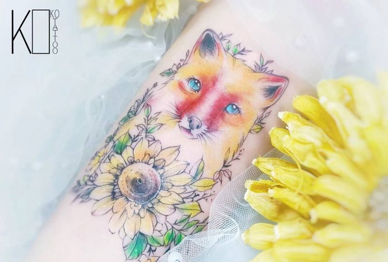 当前位置: 首页 >湖北省武汉市纹身店-KOKO TATTOO原创定制纹身店纹身图案>红狐纹身图片_手臂水彩狐狸花卉定制纹身图案