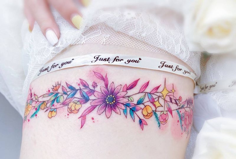 当前位置: 首页 >湖北省武汉市纹身店-KOKO TATTOO原创定制纹身店纹身图案>腿环纹身图片_腿部水彩腿环花卉水彩纹身图案