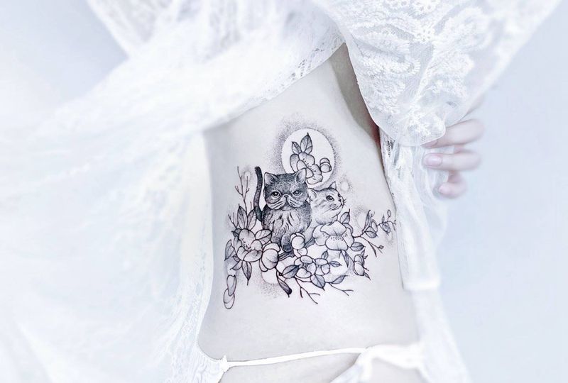 当前位置: 首页 >湖北省武汉市纹身店-KOKO TATTOO原创定制纹身店纹身图案>猫咪纹身图片_腰部腹部点刺尤加利叶猫咪定制纹身图案