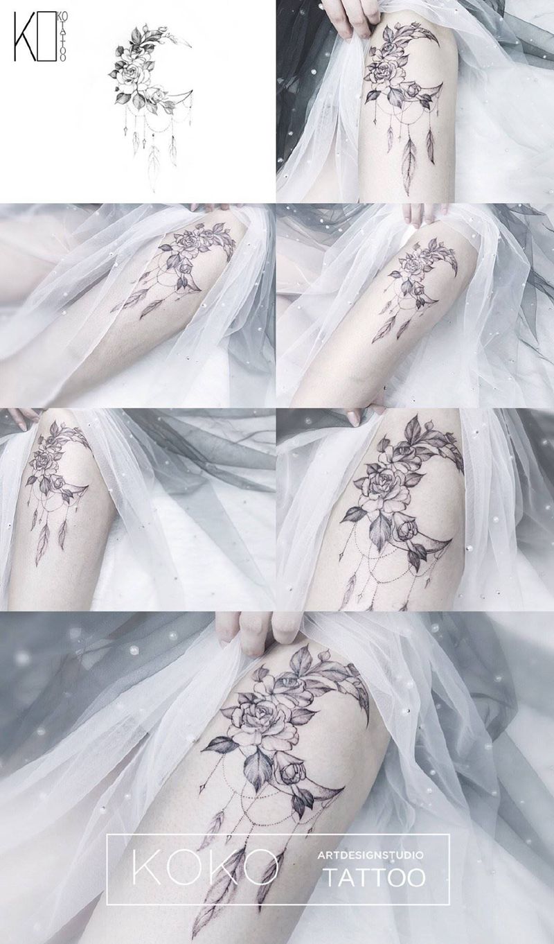 当前位置: 首页 >湖北省武汉市纹身店-KOKO TATTOO原创定制纹身店纹身图案>月亮纹身图片_腿部点刺花卉月亮羽毛纹身图案