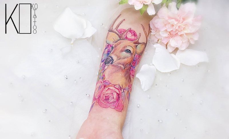当前位置: 首页 >湖北省武汉市纹身店-KOKO TATTOO原创定制纹身店纹身图案>鹿——遮盖纹身图片_手臂水彩遮盖鹿花卉纹身图案