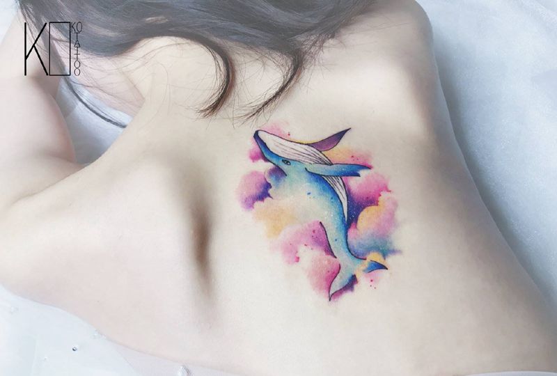当前位置: 首页 >湖北省武汉市纹身店-KOKO TATTOO原创定制纹身店纹身图案>鲸鱼纹身图片_背部水彩鲸鱼云水彩纹身图案