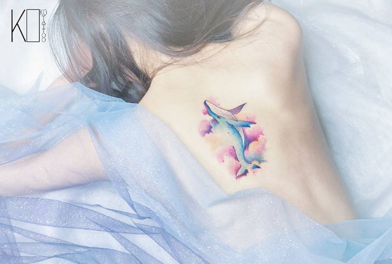 当前位置: 首页 >湖北省武汉市纹身店-KOKO TATTOO原创定制纹身店纹身图案>鲸鱼纹身图片_背部水彩鲸鱼云水彩纹身图案