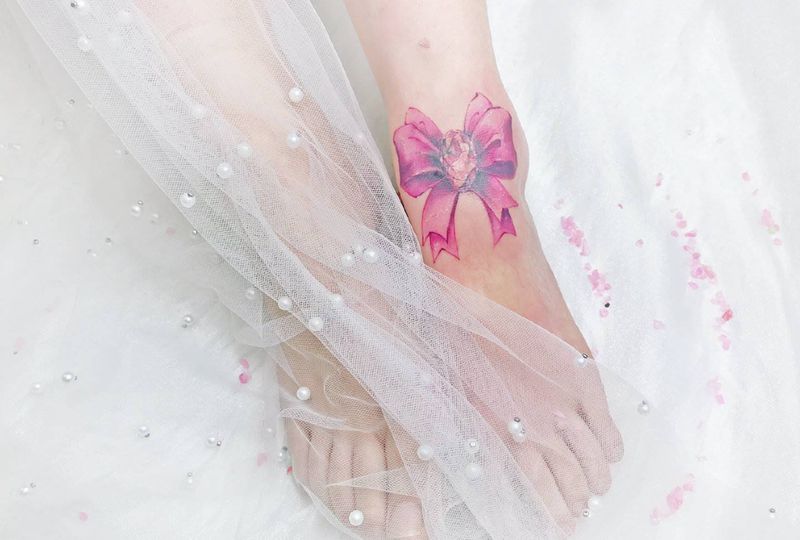 蝴蝶结——遮盖设计纹身图片_腿部水彩蝴蝶结遮盖定制设计纹身图案
