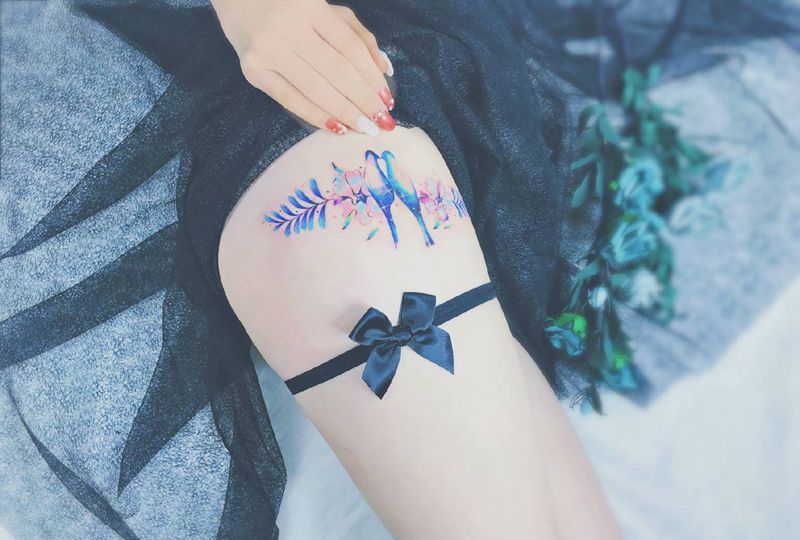 当前位置: 首页 >湖北省武汉市纹身店-KOKO TATTOO原创定制纹身店纹身图案>小鸟纹身图片_腿部水彩鸟叶子水彩纹身图案