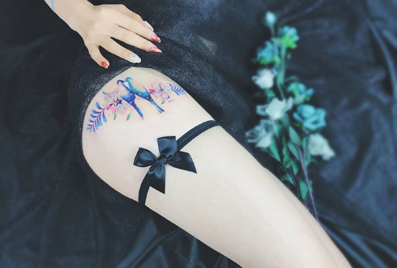 当前位置: 首页 >湖北省武汉市纹身店-KOKO TATTOO原创定制纹身店纹身图案>小鸟纹身图片_腿部水彩鸟叶子水彩纹身图案