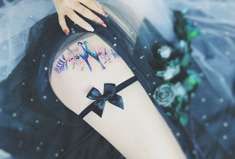 当前位置: 首页 >湖北省武汉市纹身店-KOKO TATTOO原创定制纹身店纹身图案>小鸟纹身图片_腿部水彩鸟叶子水彩纹身图案