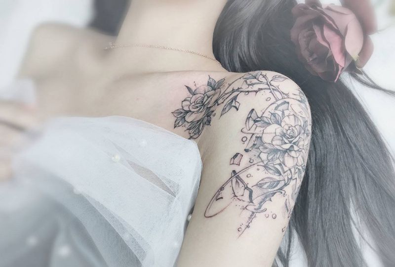 花卉纹身图片_肩部点刺花卉针痕定制纹身图案