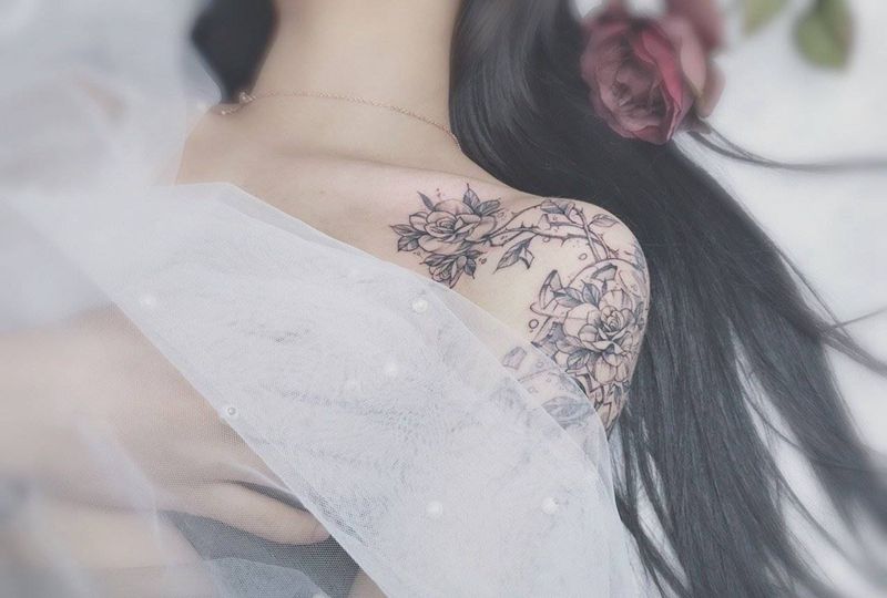 花卉纹身图片_肩部点刺花卉针痕定制纹身图案