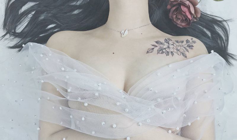 花卉纹身图片_肩部点刺花卉小清新针痕纹身图案