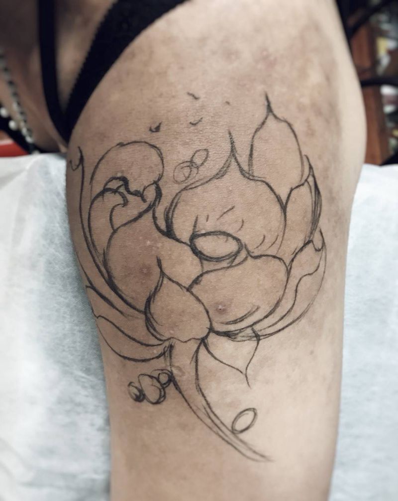 当前位置: 首页 >湖北省武汉市纹身店-塔木纹身纹身图案>小手绘,水墨荷花纹身图片_成品国画传统植物手臂肩部纹身图案