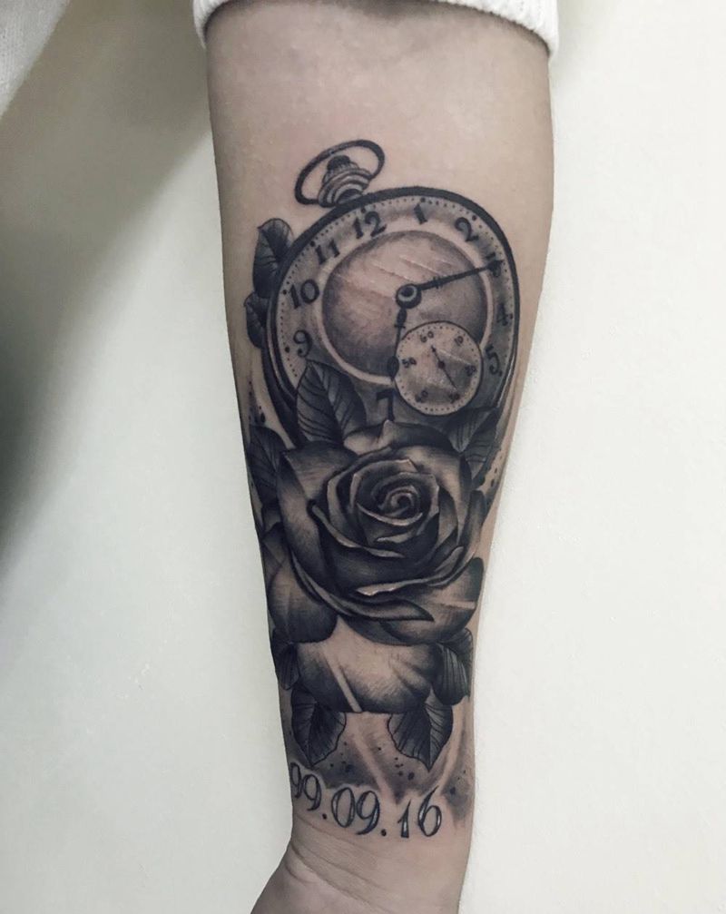 欧美时钟/玫瑰纹身图片_欧美手臂写实植物纹身图案