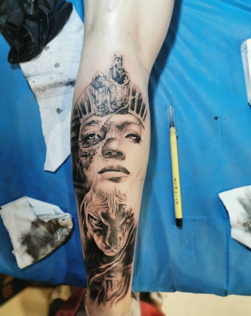 埃及使者纹身图片_腿部欧美写实纹身图案