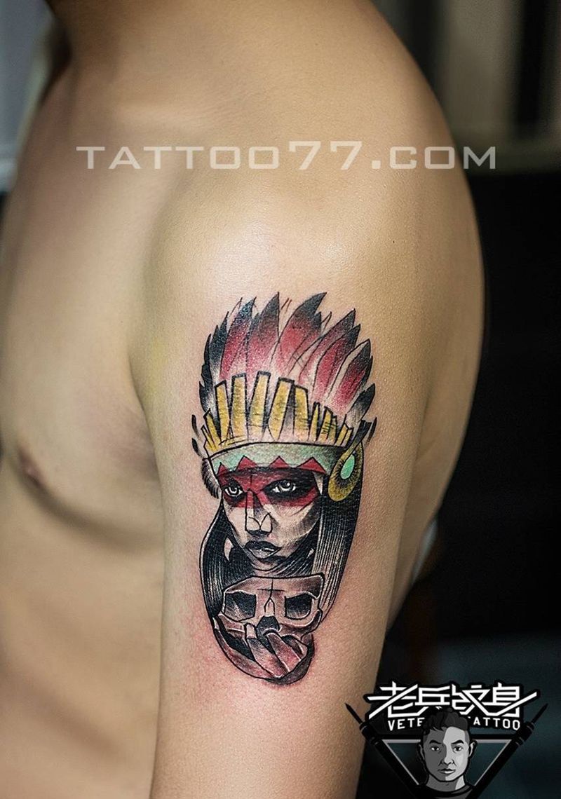 当前位置: 首页 >湖北省武汉市纹身店-武汉老兵纹身店纹身图案>大臂肖像印第安女郎蝴蝶结纹身作品纹身图片_成品手臂肖像清新人物静物纹身图案