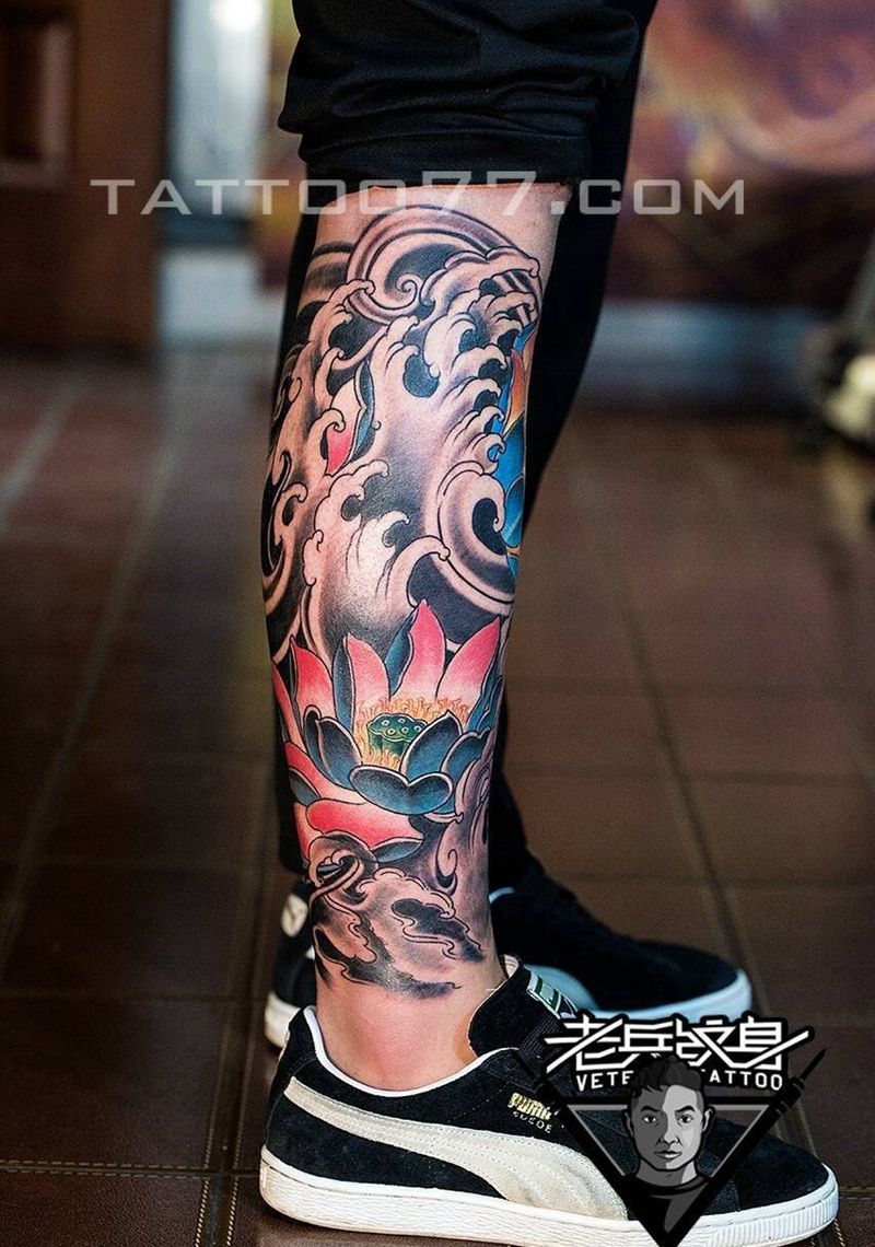 小花腿浪花莲花纹身作品纹身图片_成品腿部传统植物纹身图案