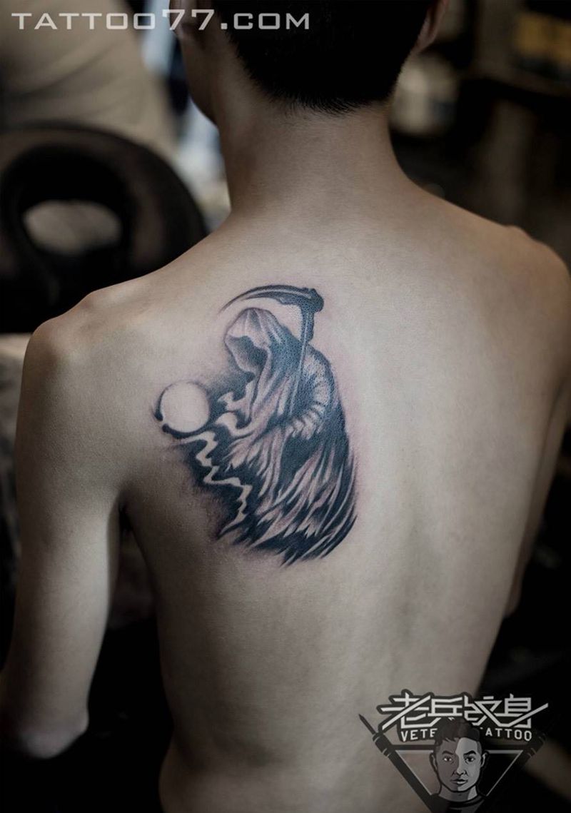 后背死神纹身作品纹身图片_成品背部欧美鬼神纹身图案