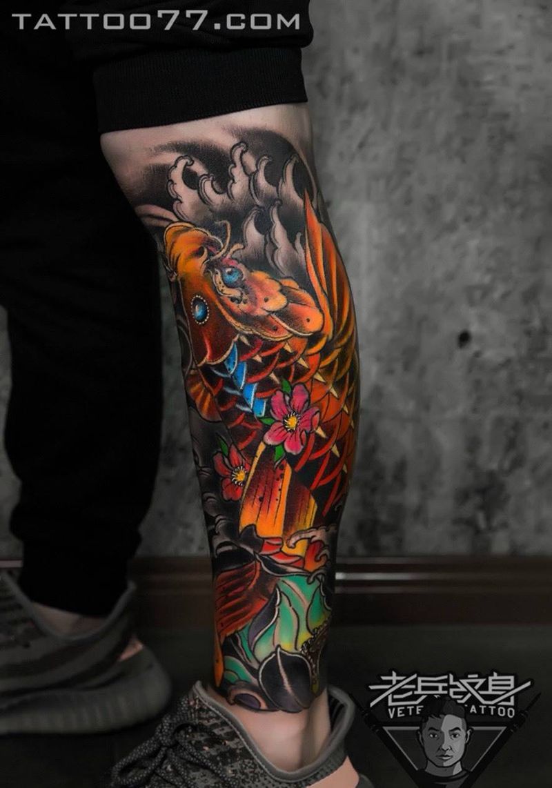 小腿鲤鱼莲花纹身作品纹身图片_成品腿部传统动物植物纹身图案