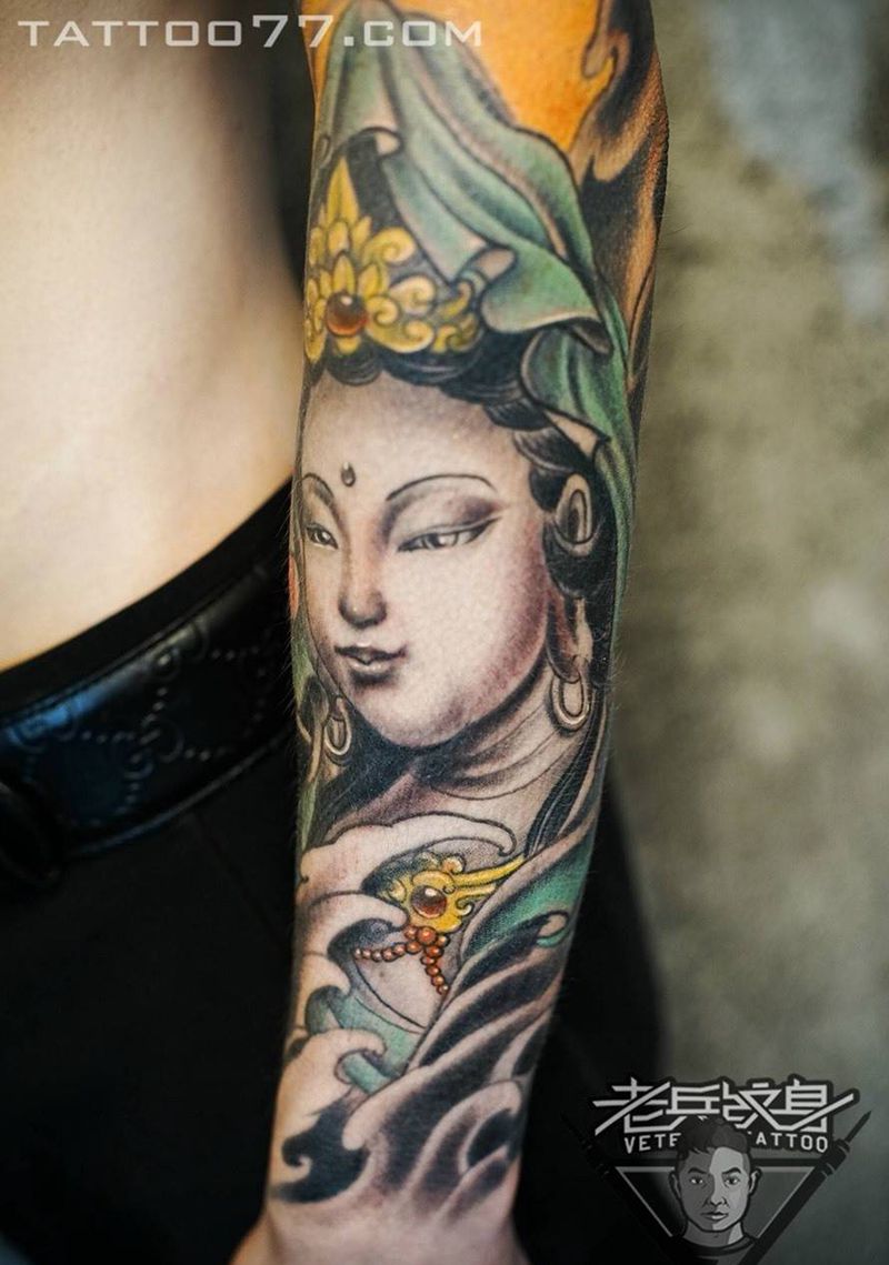 半胛花臂孙悟空观音纹身作品纹身图片_成品手臂传统人物纹身图案