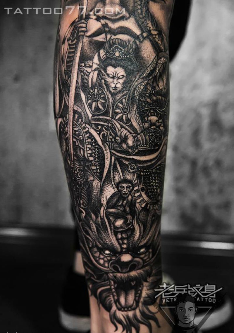 小花腿孙悟空纹身作品纹身图片_成品腿部传统鬼神人物纹身图案