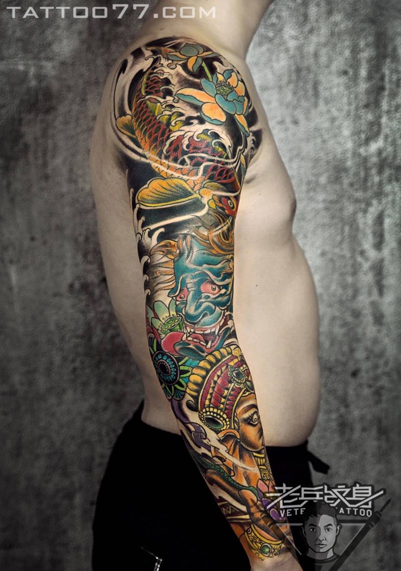 当前位置: 首页 >湖北省武汉市纹身店-武汉老兵纹身店纹身图案>彩色传统花臂鲤鱼象神纹身图片_成品手臂传统鬼神原创动物纹身图案