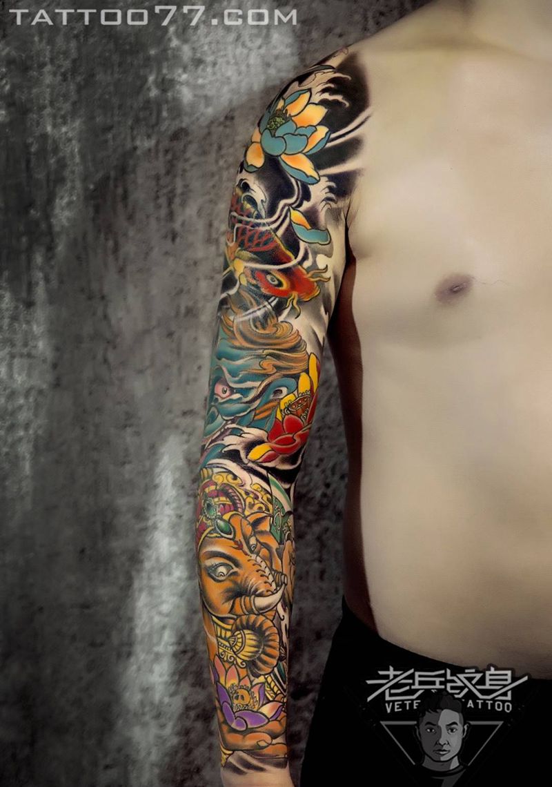 当前位置: 首页 >湖北省武汉市纹身店-武汉老兵纹身店纹身图案>彩色传统花臂鲤鱼象神纹身图片_成品手臂传统鬼神原创动物纹身图案