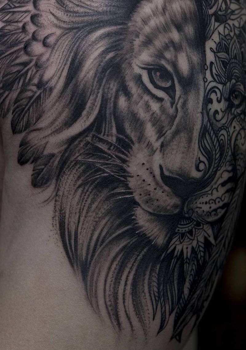 肩膀狮子翅膀纹身作品纹身图片_成品手臂写实动物纹身图案