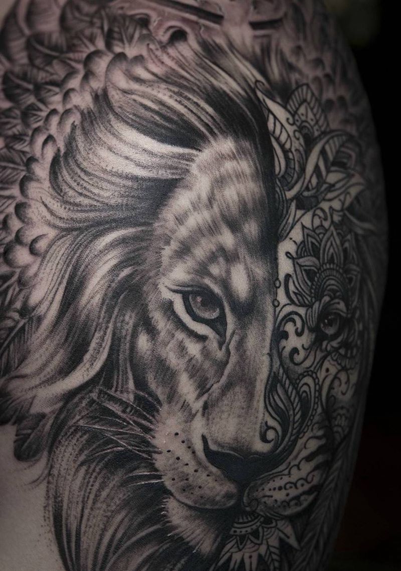 肩膀狮子翅膀纹身作品纹身图片_成品手臂写实动物纹身图案