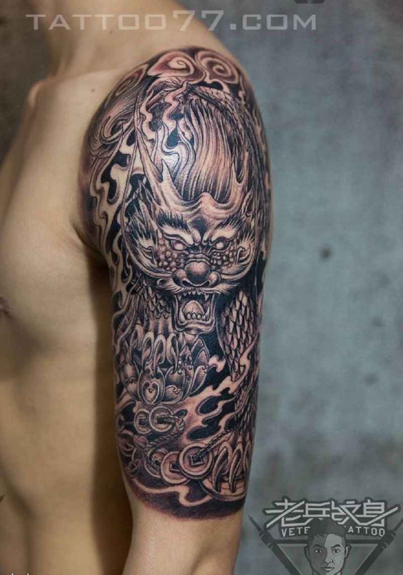 大臂麒麟纹身作品纹身图片_成品手臂传统鬼神纹身图案