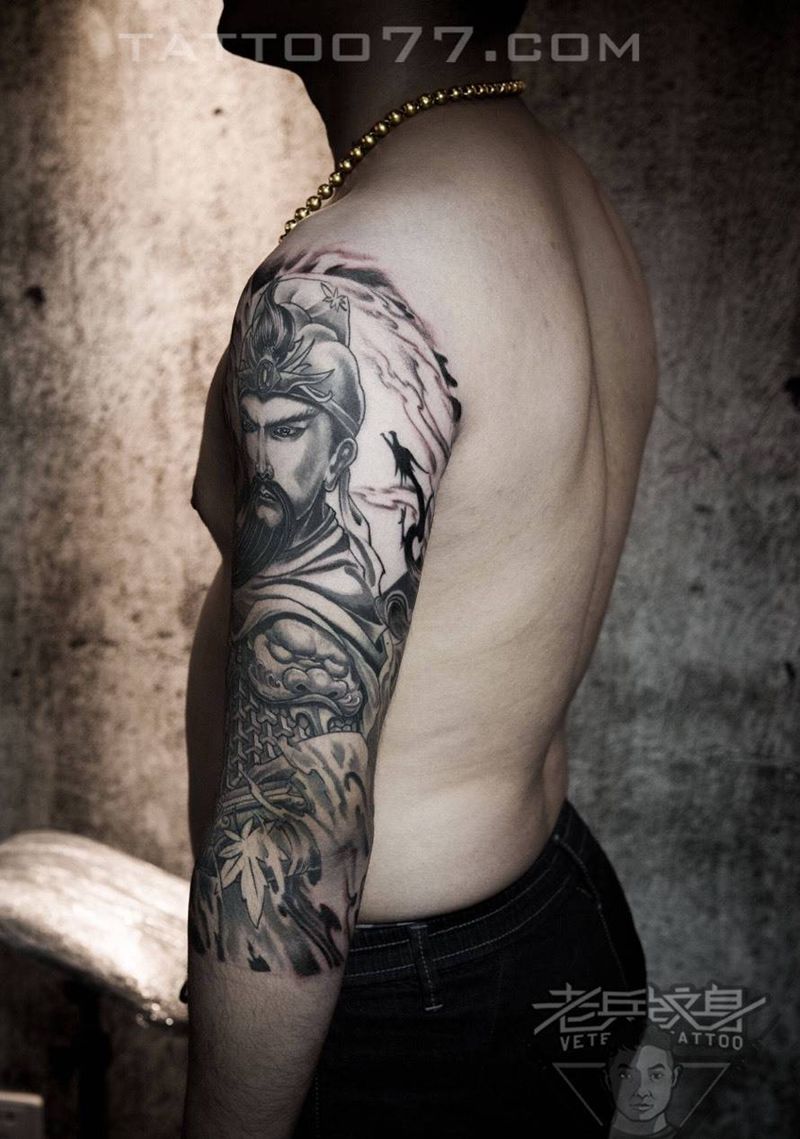 七分袖花关公花臂纹身作品纹身图片_成品手臂传统人物纹身图案